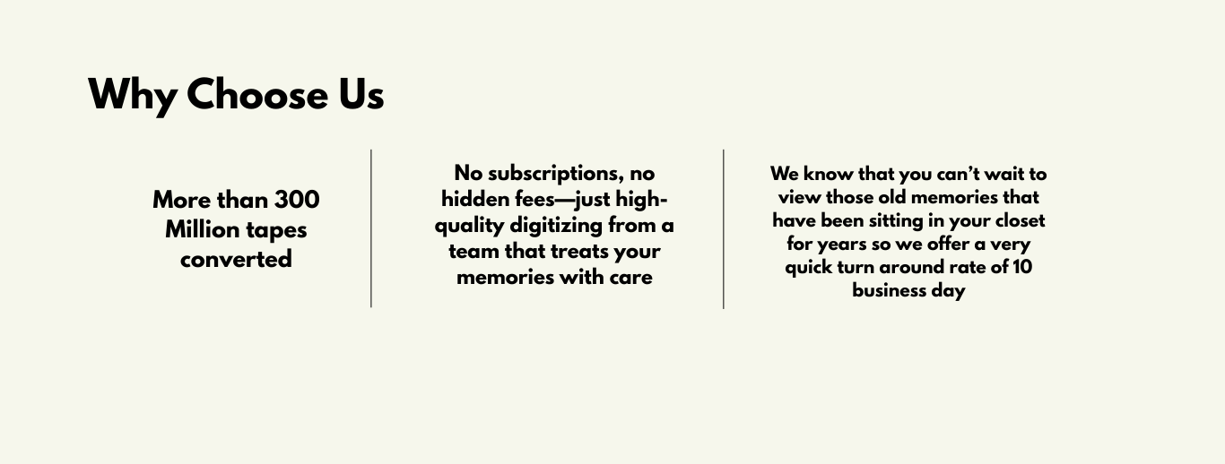 No subscriptions, no hidden fees—just high-quality digitizing from a team that treats your memories with care.